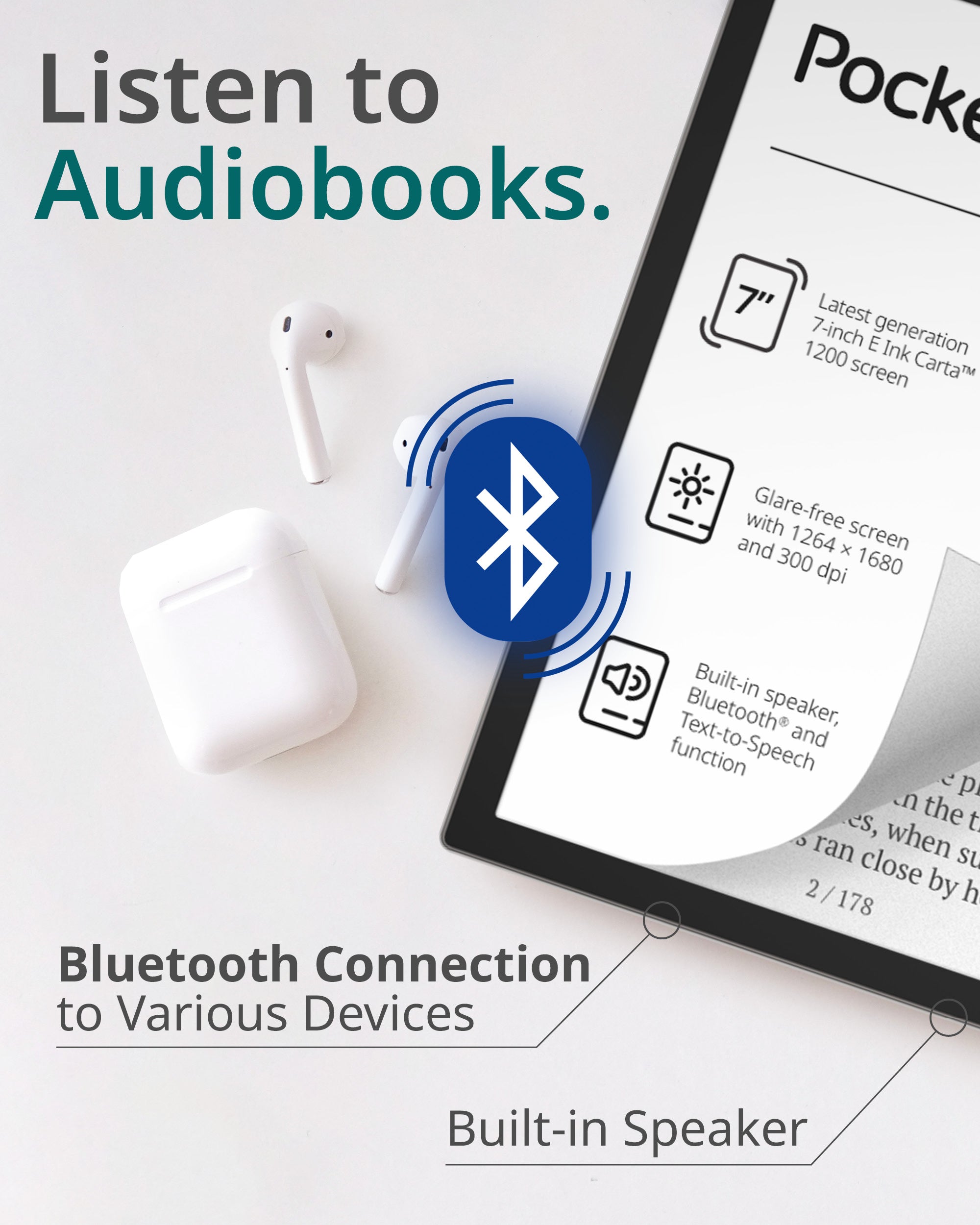 PocketBook Era supports 6 audio formats and can be paired with wireless headphones and other audio systems via Bluetooth.