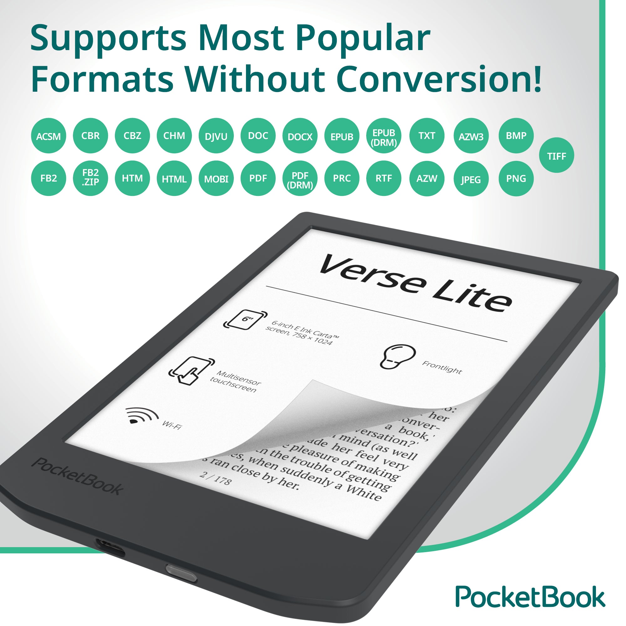 PocketBook Verse Lite supports 25 formats, which means you can load in your books in pretty much any format and it'll work just fine.