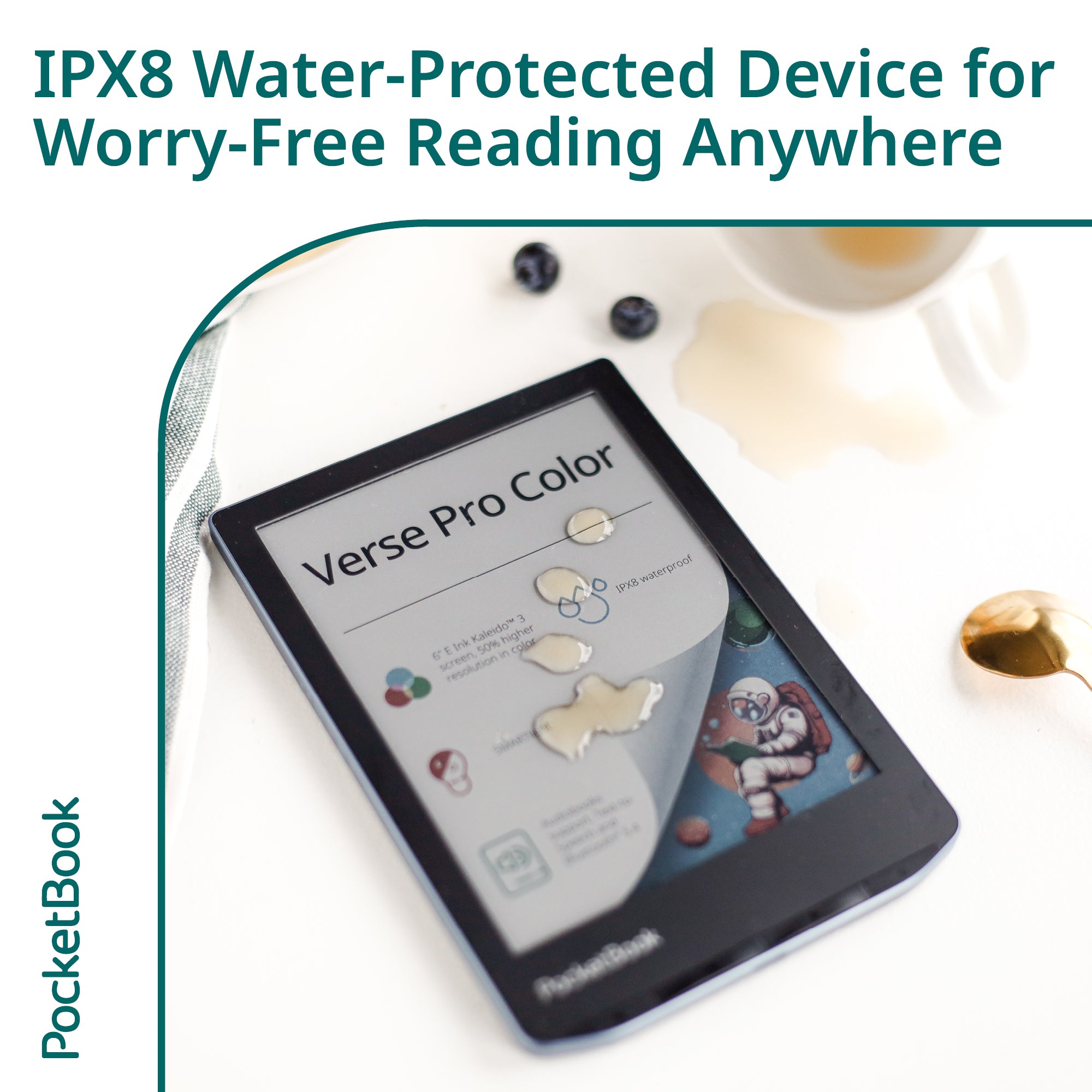 PocketBook Verse Pro Color meets the IPX8 standard, allowing it to be immersed in fresh water up to 2 meters deep for up to 60 minutes